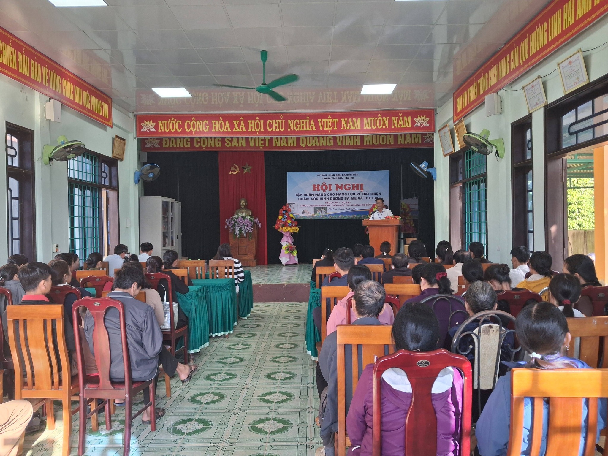 Thực hiện Tiểu dự án 2 – Dự án 3 thuộc Chương trình mục tiêu quốc gia giảm nghèo bền vững, UBND xã Cồn Tiên – Phòng Văn hóa – Xã hội tổ chức Hội nghị tập huấn nhằm nâng cao kiến thức, kỹ năng về chăm sóc dinh dưỡng cho bà mẹ và trẻ em.